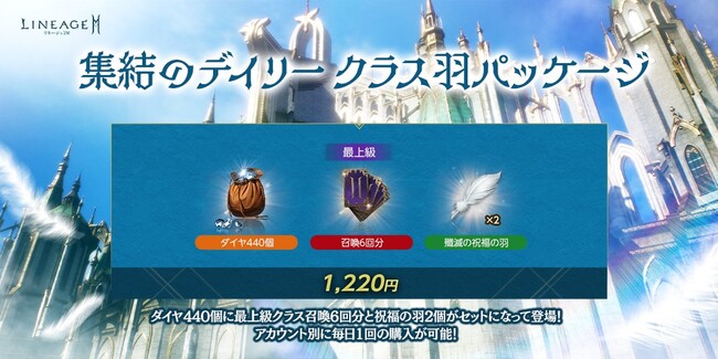 ダイヤ440個と、「殲滅の最上級クラス獲得券II(6回)(刻印)」1個、「殲滅の祝福の羽(刻印)」2個がセットになった「集結のデイリー クラス羽パッケージ」が登場しました。