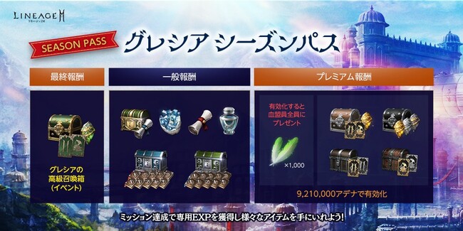 「グレシア シーズンパス」ではパスレベルが上昇することで「名誉の勲章」や「啓示の証」、「ピュアエリクサー(刻印)」などの様々なイベントアイテムのほか最終報酬では「グレシアの高級召喚箱(イベント)」を獲得することができます。