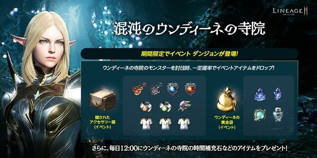 また、毎日12時に、ゲーム内郵便にて「アインハザードの祝福」1,500のほか、「ウンディーネの寺院の時間補充石(イベント)」1個、「成長のポーション(10%)(イベント)」2個、「ソウルショット(刻印)」500個をお送りします。