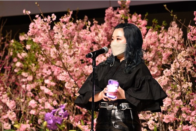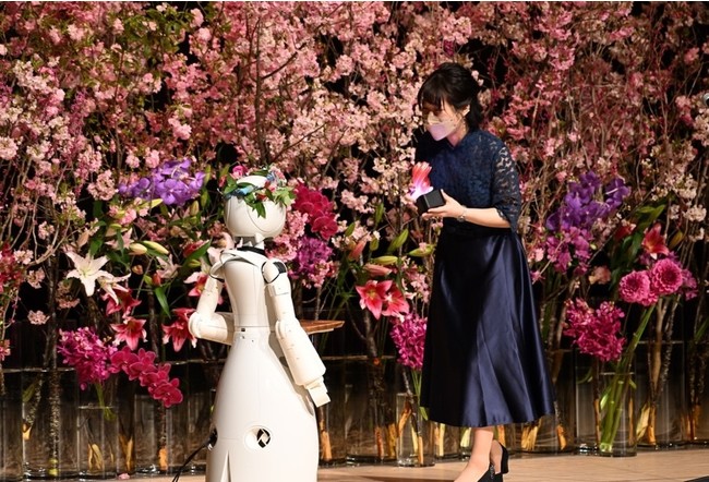 デジタルハリウッドSTUDIO渋谷の卒業生・玉澤芽衣さんによるビジュアルデザインと、そのデザインをモチーフに会場の装花をおこないました。華やかなお花の飾りを背景に、今年の司会は、ジャーナリストの堀潤さん、デジタルハリウッド大学大学院の現役院生である平松レイナさんの2名に務めていただき、特別ゲストとして、分身ロボット「OriHime-D」に、第二部の優秀作品発表会へ登場いただきました。