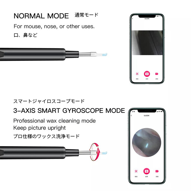 3Dジャイロモードは耳かき専用のモード。本体をどのようにひねっても、画像は直立したまま表示することができます。ご利用前に違いをお試しください。