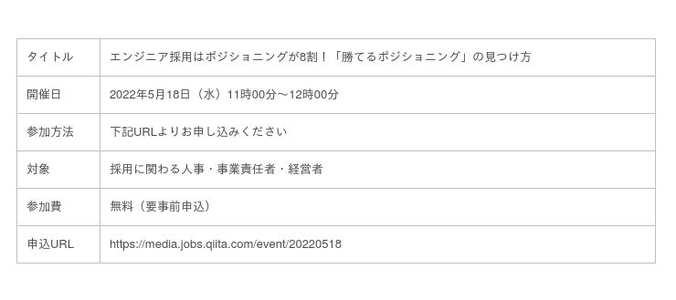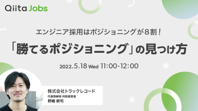 株式会社エイチームのグループ会社であるQiita株式会社(本社:名古屋市中村区、代表取締役社長:柴田健介)は、無料オンラインセミナー「エンジニア採用はポジショニングが8割!「勝てるポジショニング」の見つけ方」を2022年5月18日(水)に開催します。