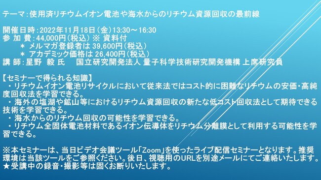 先端技術情報や市場情報を提供している(株)シーエムシー・リサーチ(千代田区神田錦町: https://cmcre.com/ )では、 各種材料・化学品などの市場動向・技術動向のセミナーや書籍発行を行っておりますが、 このたび「使用済リチウムイオン電池や海水からのリチウム資源回収の最前線」と題するセミナーを、 講師に星野 毅 氏 国立研究開発法人 量子科学技術研究開発機構 上席研究員)をお迎えし、2022年11月18日(金)13:30より、 ZOOMを利用したライブ配信で開催いたします。 受講料は、 一般:44,000円(税込)、 弊社メルマガ会員:39,600円(税込)、 アカデミック価格は26,400円(税込)となっております(資料付)。