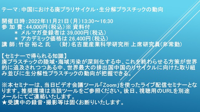 先端技術情報や市場情報を提供している(株)シーエムシー・リサーチ(千代田区神田錦町: https://cmcre.com/ )では、 各種材料・化学品などの市場動向・技術動向のセミナーや書籍発行を行っておりますが、 このたび「中国における廃プラリサイクル・生分解プラスチックの動向」と題するセミナーを、 講師に竹谷 裕之 氏 (財)名古屋産業科学研究所 上席研究員(非常勤))をお迎えし、2022年11月21日(月)13:30より、 ZOOMを利用したライブ配信で開催いたします。 受講料は、 一般:44,000円(税込)、 弊社メルマガ会員:39,600円(税込)、 アカデミック価格は26,400円(税込)となっております(資料付)。