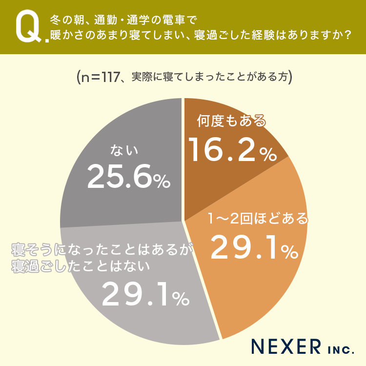 冬の朝、通勤・通学の電車で暖かさのあまり寝てしまい、寝過ごした経験があるかについて聞いてみました。
