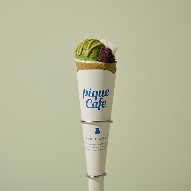 gelato pique cafeこだわりのクレープ生地に抹茶を練りこみ、求肥、あんこ、抹茶クリーム、ホイップクリームを合わせました。アクセントとして加えた黒蜜が、抹茶の美味しさをより一層引き立てます。 さらに、クレープの上には濃厚な抹茶ジェラートをトッピングし抹茶ソースをかけた、抹茶好きにはたまらない贅沢なクレープです。