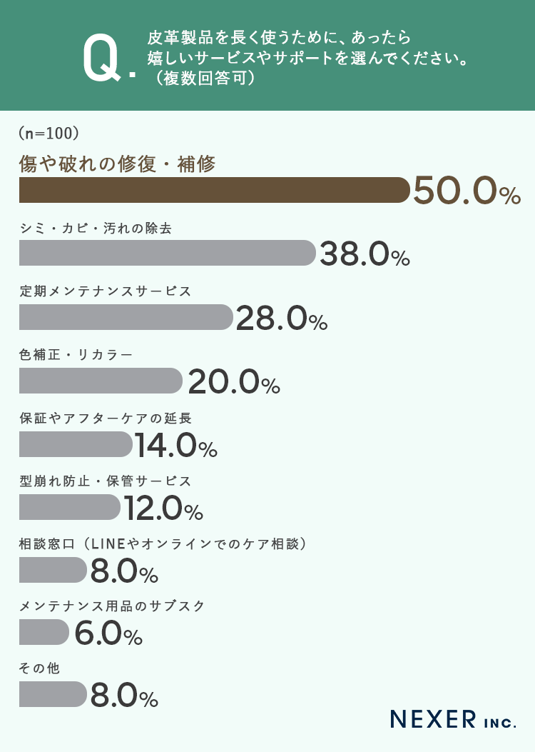 最後に皮革製品を長く使うために、あったら嬉しいサービスやサポートを選んでもらいました。