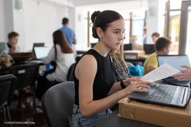 ユニセフは、ウクライナ国内や、難民の子どもや家族を受け入れている国々において、現地の政府やパートナーと協力し、質の高い教育がより広く受けられるよう支援を行っています。これには、子どもたちが各国の教育システムに組み込まれるよう支援することや、現在学校に在籍していない子どもたちに複数の学習手段を提供することも含まれます。また、すべての弱い立場にある子どもたちが教室に溶け込めるよう、語学授業の実施や、メンタルヘルスケアと心理社会的支援の提供に必要なスキルを、教員や学校職員に身につけさせることも意味します。
