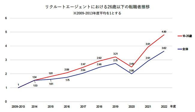 Z世代(26歳以下)の転職は、コロナ禍の影響による一時的な落ち込みを除くと、右肩上がりで増えています。2020年度まで全体との差分は一定の範囲内にとどまっていましたが、2020年度以降、全体との差がじわじわと広がりを見せています。今後も若年層の転職は増えていくと見込まれます。