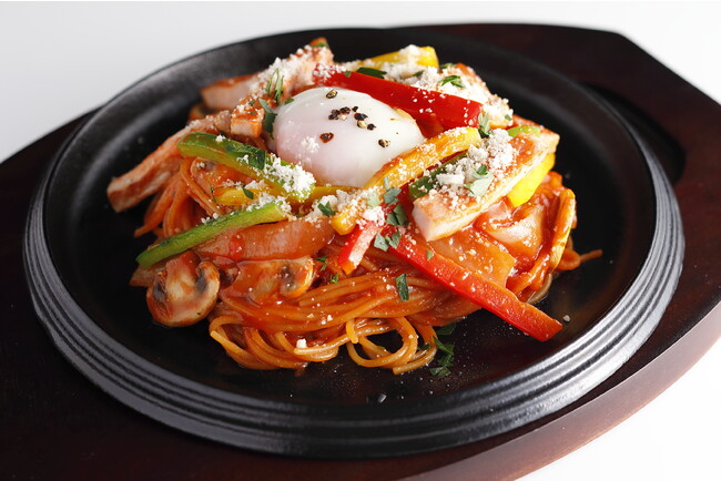 洋食の王道人気メニュー「ナポリタン」は、特製トマトソースに、*黄エンドウ豆100%の軽やかなZENBヌードルを絡め、食感豊かなパプリカとトロっと濃厚な温泉卵をトッピング。アツアツの鉄板焼スタイルで香ばしく提供します。