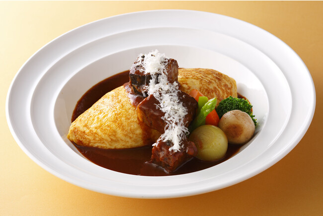 スパイシーに仕上げたホテルオリジナルブレンドの八穀米"Jシリアル"のオムライスに、柔らかく煮込んだ*尾崎牛のビーフシチューをかけた逸品。