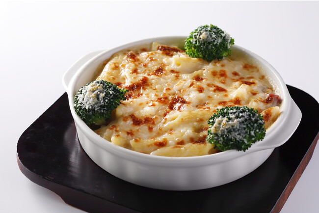 「はかた一番どり」のローストチキンとペンネパスタに、フォンティナ、モッツァレラ、パルミジャーノの3種類のチーズと豆乳の旨味たっぷりのべシャメールソースをかけ、焼き色がつくまでじっくり焼き上げました。