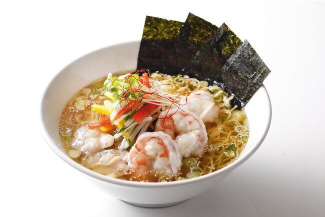 一度干して焼いた「あご」(トビウオ)出汁をベースに、干し海老、干し貝柱入りの海鮮ダレで仕上げた味わい深いスープに、特製中華麺を合わせ、海老と蛤をトッピングした海鮮麺です。