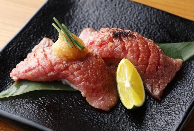 周囲を山々に囲まれ、加古川がゆるやかに流れる兵庫県西脇市の美しい風景にとけこむ 「川岸牧場」。清潔な牛舎の中では、常にクラシック音楽が流れ、ストレスを感じずにリラックスできる環境でのびのびと育てられた牛は、数々の品評会で優秀な成績を収め、その良質な脂の旨みときめ細かな肉質から“奇跡の肉”とも呼ばれています。その“川岸牧場”から直送された厳選された神戸ビーフを、ディナータイム(一部要差額)でご堪能いただけます。また、元寿司職人の経歴を持つ高木オーナー自慢の黒毛和牛の炙り握り