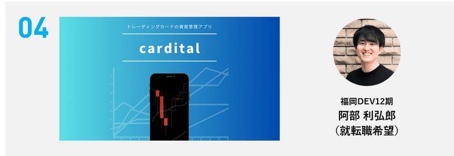 立命館大学経済学部を卒業後、大手リース会社に入社。カーリース営業を2年にわたり担当。自分の興味関心をアプリケーションとして形にしたいと考え、在職中にG’s ACADEMYに入学し、エンジニアを志す。趣味であるトレーディングカードの課題解決のため、モバイルアプリ「cardital」を開発。