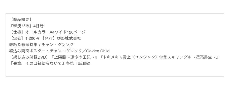 さらに今号は、綴じ込み付録として、今話題の中国・韓国ドラマ『上陽賦〜運命の王妃〜』『トキメキ☆雲上(ユンシャン)学堂スキャンダル〜漂亮書生〜』『先輩、その口紅塗らないで』の各第1話を収録したDVD付き。『上陽賦〜運命の王妃〜』は特別記事と共に要チェックです。