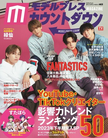 YouTube・TikTokを中心とした動画クリエイターの影響力に着目した雑誌「モデルプレスカウントダウンマガジン vol.6」が本日発売。表紙と巻頭16ページの特集には、8月16日にニューシングル「Tell Me」をリリースするFANTASTICSから、佐藤大樹、堀夏喜、八木勇征、中島颯太が登場する。