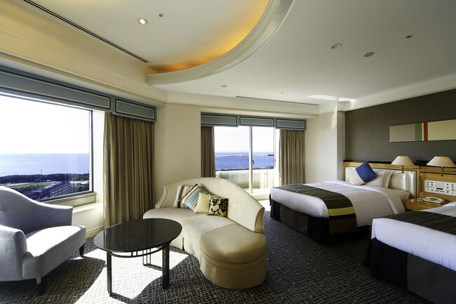 ホテルニューオータニ幕張では、千葉県の全国旅行支援「千葉とく旅キャンペーン(全国版)」の延長に伴い、絶景オーシャンビューのスイートルーム宿泊に加えて、ホテル直営レストラン・バーで利用可能なミールクーポンが1名さまあたり20,000円分付与される「オーシャンビューとサンセットを眺める憧れのスイートステイ〜朝食&ミールクーポン付〜」を2023年5月31日(水)まで販売いたします。