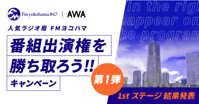 AWA株式会社(本社:東京都港区、代表取締役CEO:冨樫晃己)が運営する、サブスクリプション型(定額制)音楽ストリーミングサービス「AWA(アワ)」は、FMヨコハマで放送されるAWAコラボ番組への出演をかけた、『人気ラジオ局「FMヨコハマ」番組出演権を勝ち取ろうキャンペーン』を11月より開催。今回1stステージを通過した14名を発表いたしました。