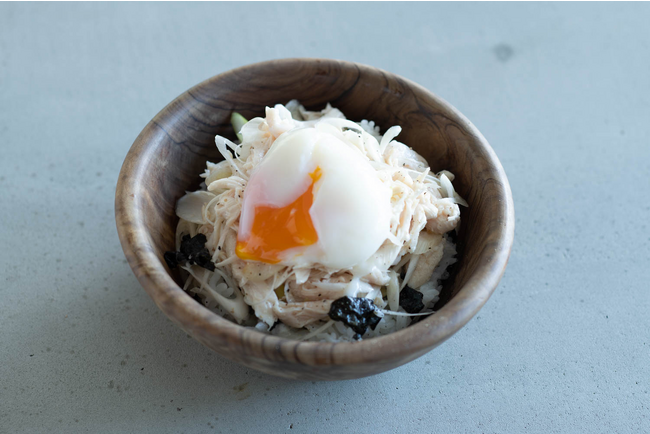 若手アスリートのため低予算でもしっかりたんぱく質をとれるようにと考案した、ごま油であえたねぎとささみ、温たまをのせた丼もの。