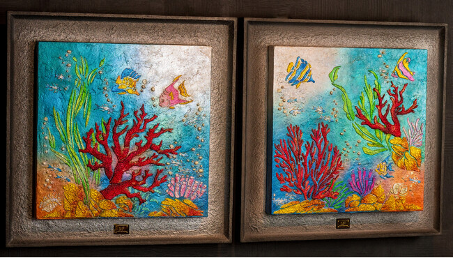 左:「Gioielli di Mare A(海の宝石 A)」フレームサイズ52.5×52.5cm 油絵純金銀彩 2023年