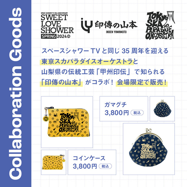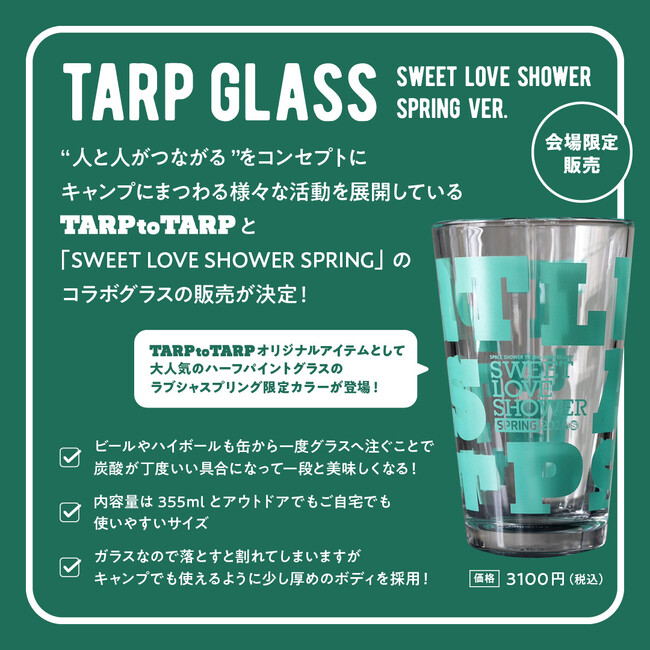 先日、オフィシャルグッズや会場でしか手に入らないコラボグッズ、多彩な飲食店、アーティストコラボフードなど様々な情報を解禁!3月31日まで先行販売中のオフィシャルグッズは、春にぴったりのTシャツやロンTからラブシャ定番グッズまで様々なアイテムを展開。さらに、スペースシャワーTVと同じく35周年を迎える東京スカパラダイスオーケストラとのコラボグッズも会場限定販売が決定!コラボグッズは山梨県の伝統工芸品である「甲州印伝」で知られる「印傳の山本」とタッグを組み、山梨の伝統と新たなカルチャーが融合した甲州印伝コインケースとガマグチを製作、スカパラメンバーのアイデアも盛り込まれた逸品に。また、ラブシャ史上初となるキャンプサイト「SWEET LOVE SHOWER CAMP with TARPtoTARP」の共同プロデュースをしているTARPtoTARPとコラボグラスも会場限定で販売決定!TARPtoTARPのオリジナルアイテムとして大人気のハーフパイントグラスにラブシャスプリング限定カラーが登場します。グラスはキャンプでも使えるように少し厚めのボディを採用。キャンプサイトを利用する方も要チェックです!