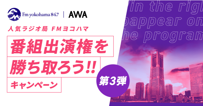 AWA株式会社(本社:東京都港区、代表取締役CEO:冨樫晃己)が運営する、サブスクリプション型(定額制)音楽ストリーミングサービス「AWA(アワ)」は、FMヨコハマで放送されるAWAコラボ番組への出演をかけた、『人気ラジオ局「FMヨコハマ」番組出演権を勝ち取ろうキャンペーン』を12月より開催。