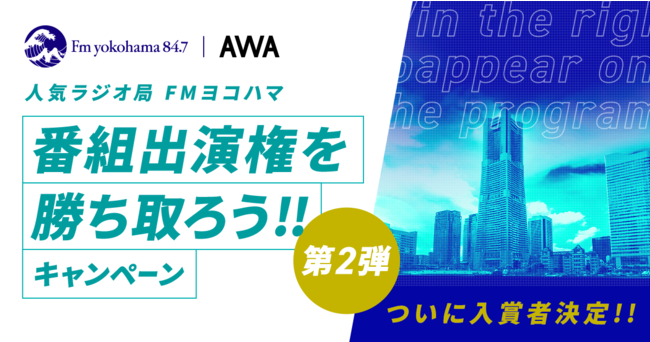 本キャンペーンは、FMヨコハマのAWAコラボ番組にMC出演。または、自分をPRできるコーナーに出演できる権利を賭けた企画となります。今回2ndステージを勝ち抜き、各部門で見事入賞した7名を発表いたしました。また、第三弾のエントリーも開始しています。