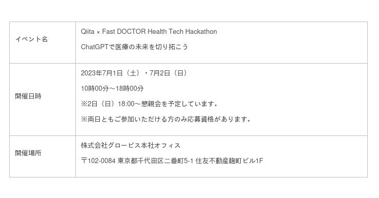 株式会社エイチームのグループ会社であるQiita株式会社(本社:名古屋市中村区、代表取締役社長:柴田健介、以下当社)は、ファストドクター株式会社(本社:東京都港区、代表取締役医師:菊池 亮、代表取締役:水野 敬志、以下ファストドクター社)と共同で 、2023年7月1日(土)・2日(日)にハッカソン※2「Qiita × Fast DOCTOR Health Tech Hackathon ChatGPTで医療の未来を切り拓こう」を開催します。本ハッカソンの開催に伴い、出場チームを募集します。