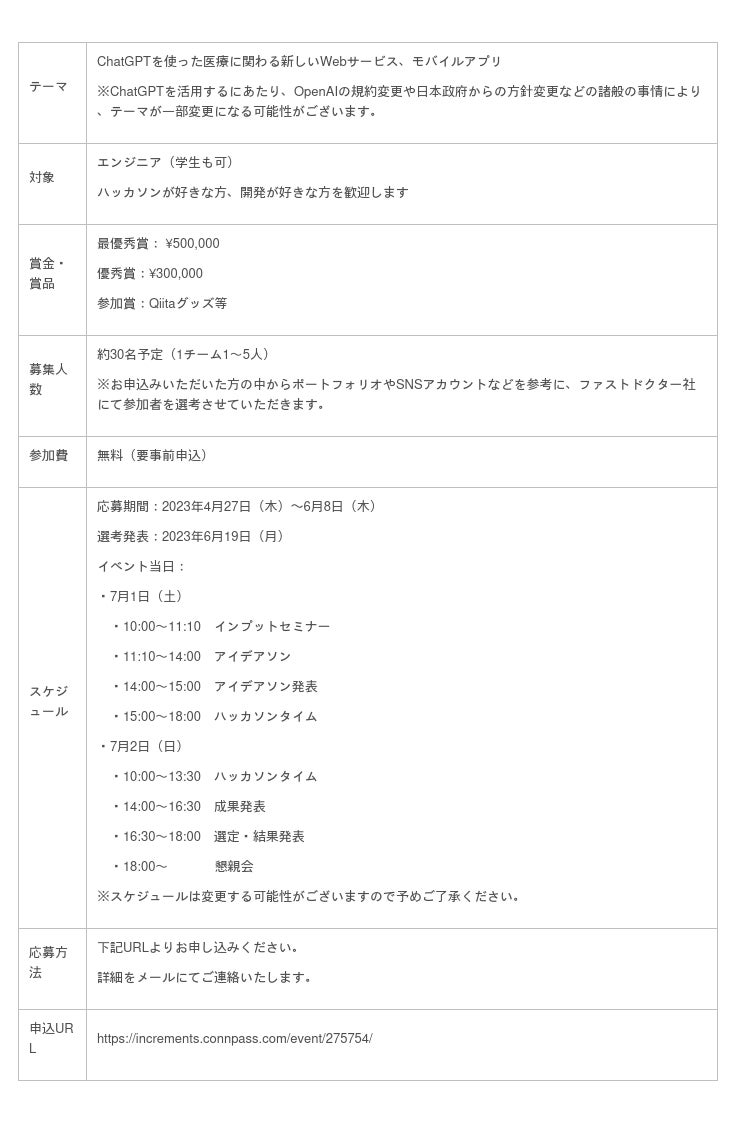 7月1日(土)・2日(日)の2日間に渡り、「Qiita × Fast DOCTOR Health Tech Hackathon ChatGPTで医療の未来を切り拓こう」をテーマに、ChatGPTを活用して医療に関する新しいWebサービス、モバイルアプリのプロトタイプの企画・開発を行っていただきます。