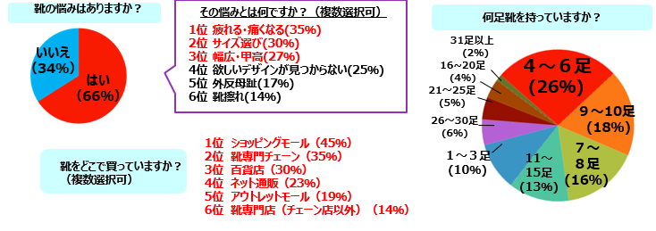 ★66%が靴に悩みあり! サイズ不一致や痛みなど足の形に関する悩みが多数