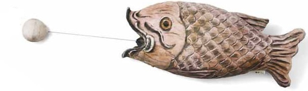 禅宗のお寺、主に黄檗宗(おうばくしゅう)寺院で見ることができる魚の形をした木製の法具です。魚の形である理由は、魚は眠るときも目を開けていることから、寝る間を惜しみ日夜修行に励むようにという修行僧への戒めの意味が込められたためだと言われています。 主に魚板をたたいて食事や法事の時間を伝えるために使われました。口から出ている珠は煩悩を表す「あぶく」で「貧(とん)・瞋(じん)・痴(ち)」といい、人が持つ根本的な三つの煩悩「三毒(さんどく)」を表していると言われています。