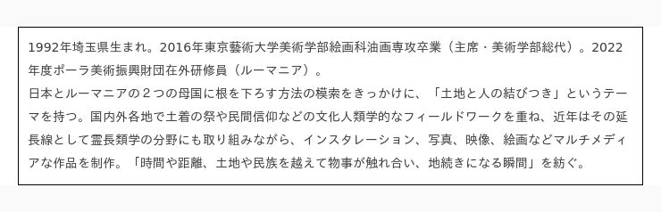 1992年神奈川県生まれ。東京造形大学を卒業。オーストリア ウィーン芸術アカデミーの留学経験を持ち、在学中から、モデル、エッセイ、写真、ペインティング、ラジオパーソナリティなど幅広く活動。アート、映画、本にまつわるエッセイを雑誌やWEBで寄稿している。