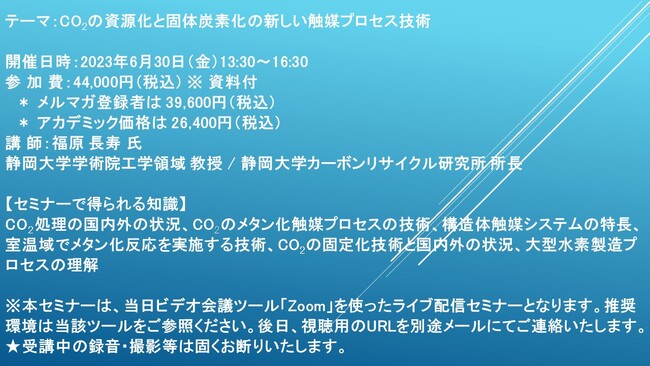 先端技術情報や市場情報を提供している(株)シーエムシー・リサーチ(千代田区神田錦町: https://cmcre.com/ )では、 各種材料・化学品などの市場動向・技術動向のセミナーや書籍発行を行っておりますが、 このたび「CO2の資源化と固体炭素化の新しい触媒プロセス技術」と題するセミナーを、 講師に福原 長寿 氏 (静岡大学学術院工学領域 教授 / 静岡大学カーボンリサイクル研究所 所長)をお迎えし、2023年6月30日(金)13:30より、 ZOOMを利用したライブ配信で開催いたします。 受講料は、 一般:44,000円(税込)、 弊社メルマガ会員:39,600円(税込)、 アカデミック価格は26,400円(税込)となっております(資料付)。