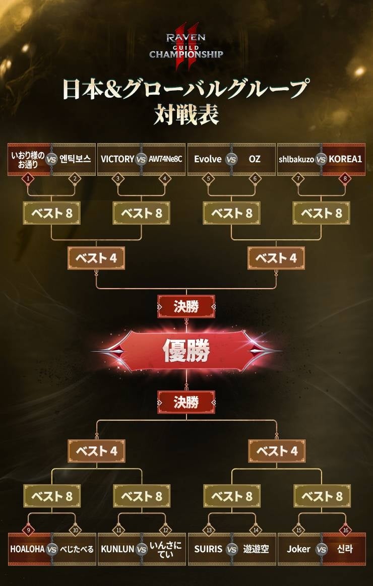 本試合は、韓国リージョン、グローバル・台湾/香港/マカオリージョン、日本・グローバルリージョンの各グループから最強ギルドを決める大会です。各グループにて、参加条件を満たすギルドの中から最大16のギルドが選抜され、争奪戦のルールに応じて対戦表が編成されます。参加ギルドにはクリスタルが報酬として配布され、優勝ギルドには、8,000,000 クリスタル(無償)が贈られます。