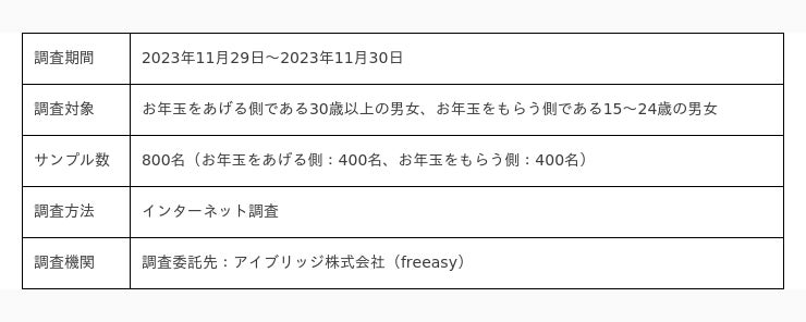 玉をあげる側である30歳以上の男女、お年玉をもらう側である15〜24歳の男女合計800名を対象に、