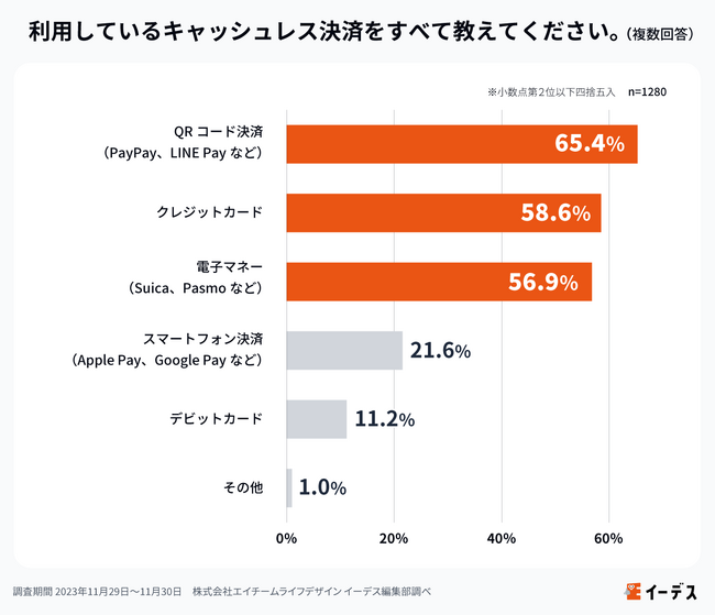 調査結果によれば、キャッシュレス決済は今や当たり前となっており、QRコード決済を利用する人が特に多いようです。