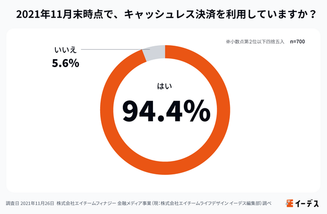 2021年11月末に実施したアンケート結果では、キャッシュレスを利用している人は94.4%※と、今回よりも約20%も多い結果となっています。