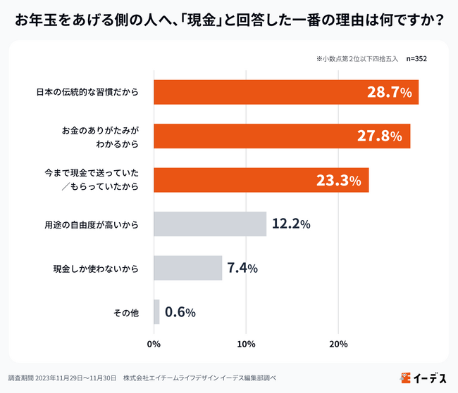 お年玉に「現金」を選んだ一番多い理由は、あげる側が「日本の伝統的な習慣だから(28.7%)」で、もらう側が「今まで現金でもらっていたから(35.7%)」