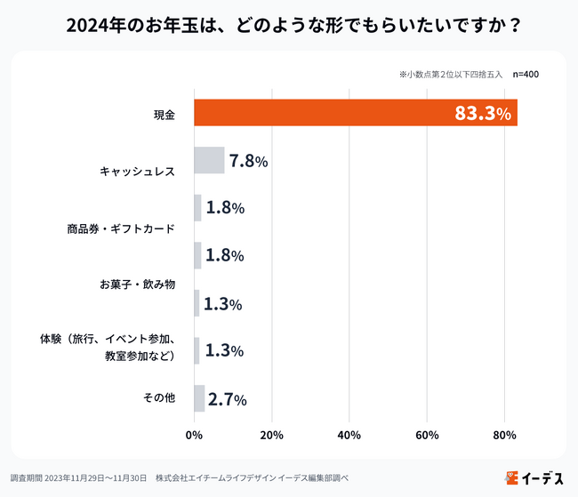 さらに、お年玉の受け渡し別で調査したところ、あげる側ともらう側のどちらもが「現金」を望んでいることがわかりました。(あげる側:88.0%、もらう側:83.3%)
