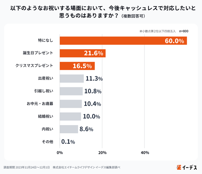 また、キャッシュレス化を望むお祝い事は「特になし(60.0%)」が大半を占める結果となったのは、"気持ち"を大切にする傾向にある日本人らしい結果なのかもしれません。