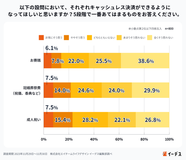 「お賽銭・冠婚葬祭費・お年玉において、キャッシュレス決済ができるようになってほしいと思いますか?」と質問したところ、お賽銭・冠婚葬祭費では60%以上、成人祝いでは約半数の人が「あまりそう思わない」「全くそう思わない」と回答しました。