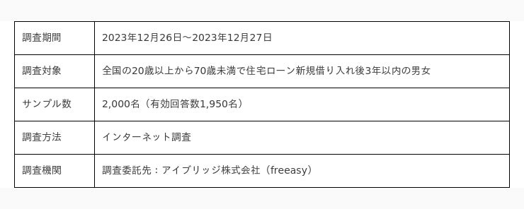 株式会社エイチームのグループ会社である株式会社エイチームライフデザイン(本社:愛知県名古屋市、代表取締役社長:間瀬文雄)は、暮らしの「まよい」を解決する情報メディア「イーデス」にて、直近3年以内に新規で住宅ローンを利用した2,000名を対象に「住宅ローンの借り入れ状況・利用満足度調査(2023年下半期)」を実施しました。