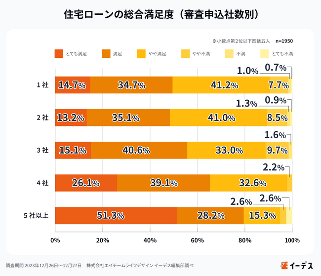今回の調査で、5社以上に審査を申し込んだ人の過半数が利用中の住宅ローンに対して「とても満足」と回答しました。