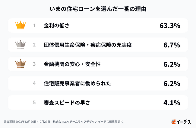 利用中の住宅ローンを選んだ一番の理由として「金利の低さ」と回答した人は63.3%
