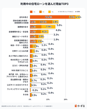 また、利用中の住宅ローンを選んだ理由のTOP3についても聞いたところ、「金利の低さ」の次に重視されているのは「団体信用生命保険・疾病保障の充実度」であることがわかりました。