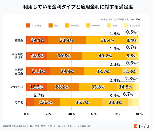 金利タイプ別に見ると、変動型・固定期間選択型を利用している人の約90%は「とても満足」「満足」「やや満足」と回答しています。これに対し、全期間固定型は84.8%、フラット35は80.3%、その他金利タイプは66.7%と、満足度がやや低めです。
