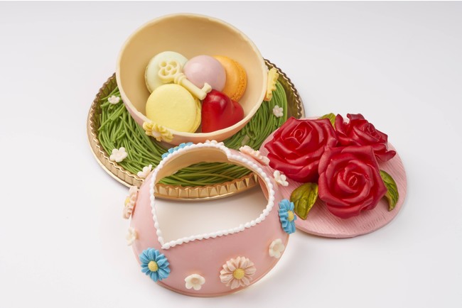 「愛情」の花言葉をもつ深紅のバラがブーケのようにあしらわれており、普段はなかなか伝えられない相手への気持ちを密やかに告げるスイーツです。中には可愛らしいマカロンやボンボンショコラと、心の扉を開く鍵をモチーフにしたチョコレートが入っています。受け取った方が思わず笑顔になるようなキュートで情熱的なギフトです。