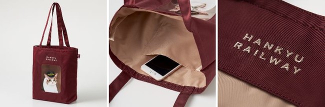 猫車掌さんが車窓から敬礼しているイメージのトートバッグです。表地は阪急電車のマルーンカラー、内生地は木目調の車内をイメージした色みを採用しました。底まち付きでA4サイズが入る大きさなので、いつものお出かけやお買い物に便利です。かぎやスマホ、定期などを入れるのに便利な内ポケット付きです。「HANKYU RAILWAY」の文字は金糸の刺しゅうで高級感を出しました。