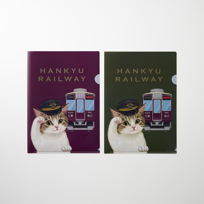 阪急電車をバックに敬礼をする猫車掌さんがかわいいクリアファイル2枚セットです。ご自宅や職場などで活用してください。トートバッグに入れて、おそろいで持ち歩くのもおすすめです。